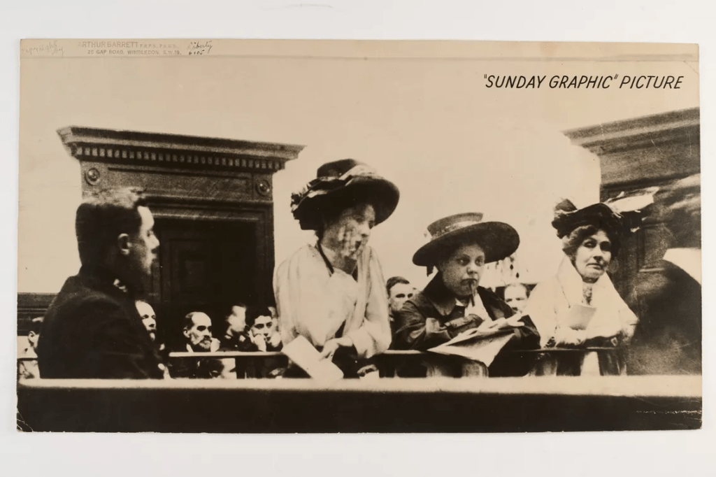 Fig 1: Emmaline & Christabel Pankhurst and Flora Drummond in the dock of Bow Street Magistrates Court, 1908 Image Source: London Museum