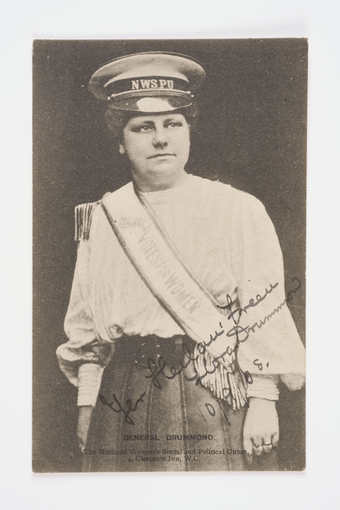 Fig 2: A signed postcard, with a portrait of Flora Drummond (1879-1949). Beneath is printed ‘General Drummond’. Image Source London Museum