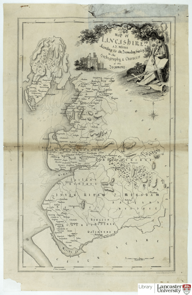The earliest map is shown below by J. and C. Walker. ‘Lancashire A.D. 1086 according to the Doomsday Survey’